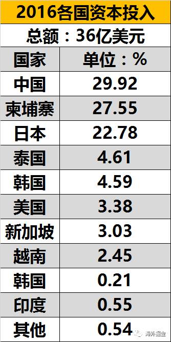 中国的热钱正在不断涌入这个东南亚国家的首都,从你下飞机在俄罗斯大道上途径的各个施工地就能看出。为了印证观点,我从柬埔寨政府文件中找到2012-2016年以来投资柬埔寨的国家金额以及占比: