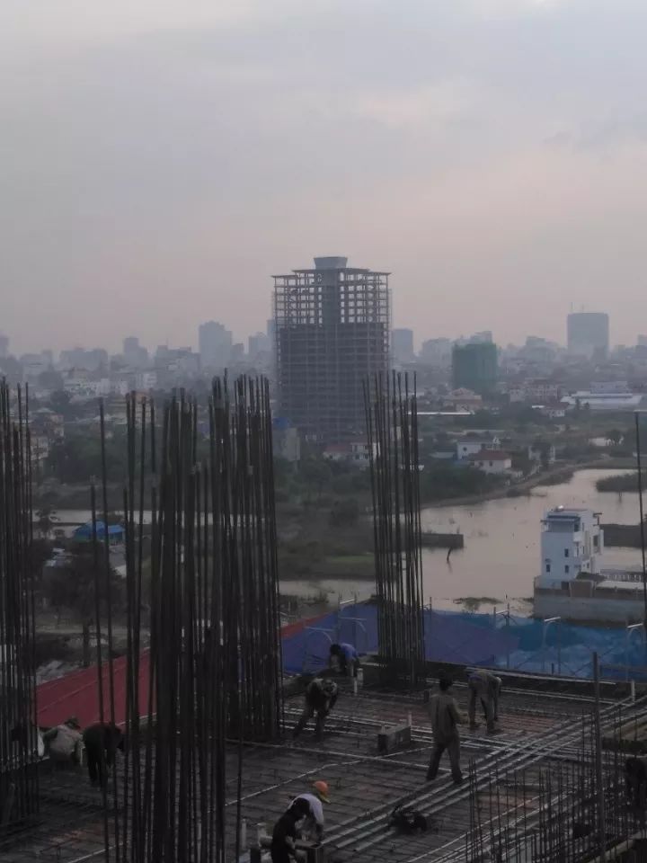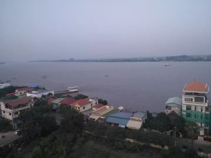 它的均价在2500美元/平米,大楼前是他们的售楼处,5层楼高,面临河海。负责人把我们带到售楼处的顶楼,一眼望去视野开阔,但是看遍上海黄浦江两岸高楼林立、广州珠江彼岸的繁华模样,从鸭子岛看向金边市中心时,却是一整片平静悠闲…