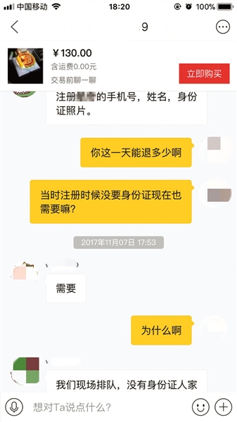 除了收取的费用以外,张青还要求北青报记者提供了注册账号时使用的手机号、姓名和身份证照片。就在给黄牛付款后的第二天,北青报记者收到了退回的押金。