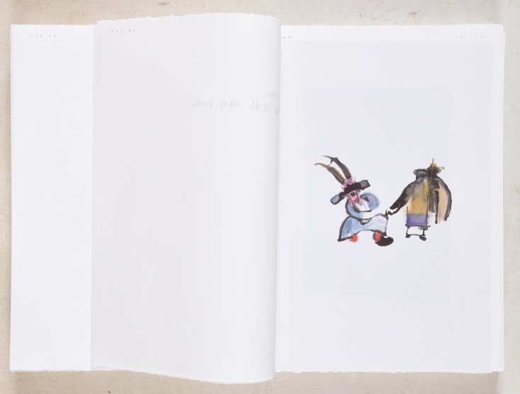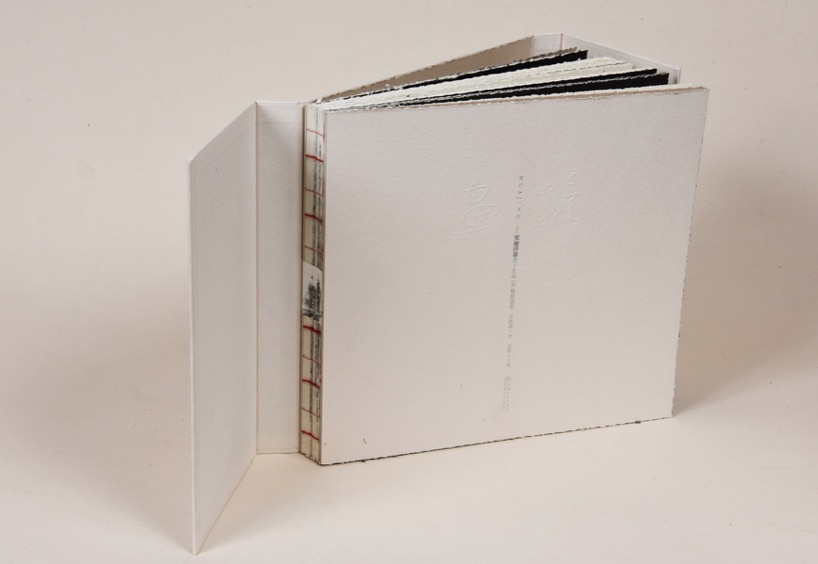“硬封一半左翻,一半右翻,结构独具特色。裸脊使用红色锁线,中部贴有一幅极小的作品,细节考究而别致。三面书口作了打毛处理,与内页绘画的笔法风格形成呼应。巧妙穿插的模切黑页,使黑白画册的单调感不复存在。”