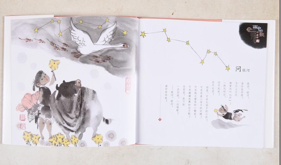“护封的动物形态模切凸显了封面上的书名,配合烫银手法,营造出童话趣味和现代气息。以水墨绘制插图,生动活泼,使儿童读者易于接受。书页上有文字作为装饰,各个分册都有不同的基本色调,时尚靓丽。”