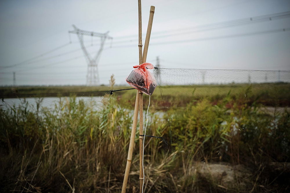 在毗邻天津北塘水库的一片芦苇地,志愿者们再次搜寻到一片非法捕鸟区域。捕猎者在开辟出来的小道上,用竹竿撑起高约一米五,长达上百米的捕鸟网,密布于这片人迹罕至的芦苇丛里。被困的鸟儿大多已经死亡,仍然活着的,也已失去了挣扎的力气,奄奄一息。