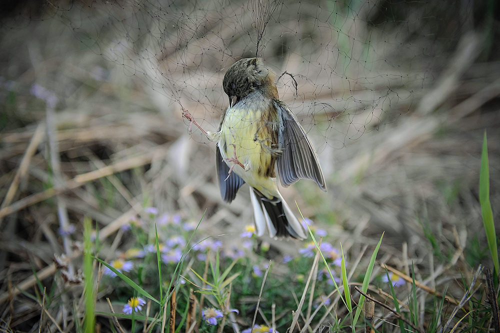 深秋时节,泛黄的芦苇丛上,一只灰头鹀从西伯利亚乘风而来,它已经飞了3000公里,到达中国的渤海之滨,它还要再飞3000公里,前往遥远的东南亚越冬。这是一年一往返的伟大旅行。然后,啪的一声,它挂上了一张大网。这场旅行甚至它的生命都将在此终结。