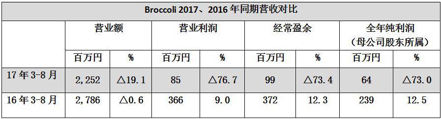 上半季度,Broccoli营业额22亿5200万日元;营业利润8500万日元;经常盈余9900万日元;纯利润6400万日元,均比去年同期下滑,纯利润更是缩水73%。