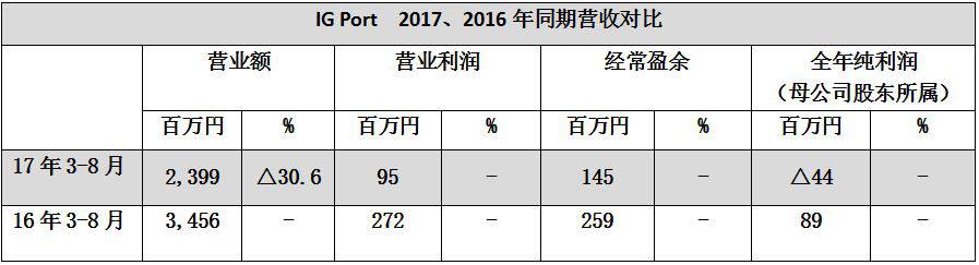 整体上IG Port营业额23亿9900万日元,同比减少30.6%,总利润减少4400万日元。