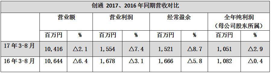 2017年度上半季度,伴随的媒体业务的大幅减收,创通营业额104亿1600万日元,同比下降2.1%;营业利润15亿5400万日元,同比下降7.4%;经常盈余减少8.7%,仅为15亿2100万日元;最终纯利润10亿5100万日元,同比减少2.9%。