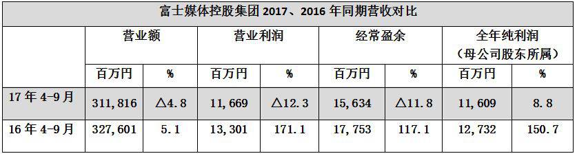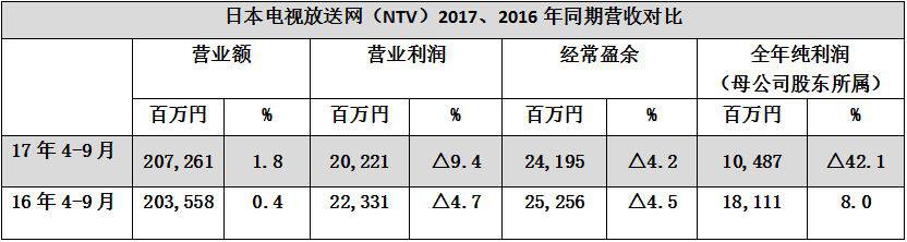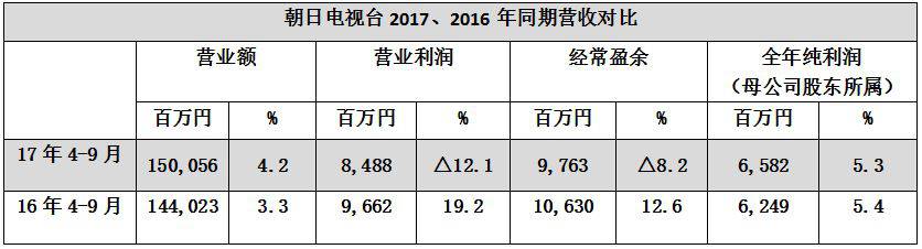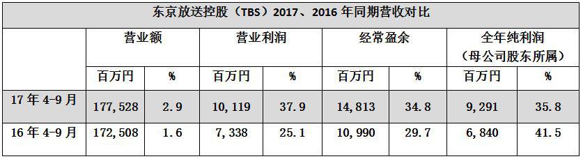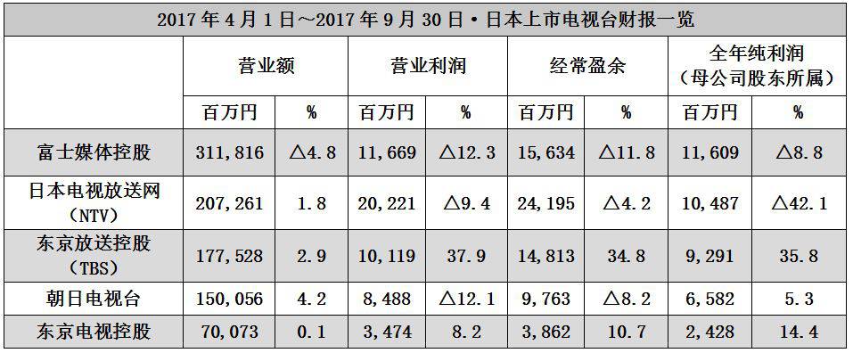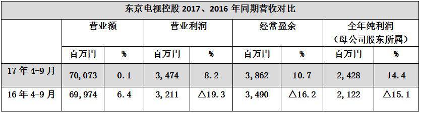 2017年上半季度,东京电视控股集团各营业额700亿7300万日元,同比增长0.1%。营业利润34亿7400万日元,同比增长8.2%。当季纯利润24亿2800万日元,同比增长14.4%。