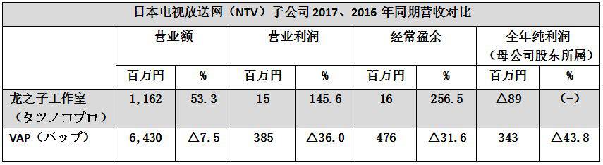 日本电视放送网(NTV)旗下龙之子工作室以及影音公司VAP也没能挣脱出赤字的泥潭。即使上半季度出现大热动画电影《玛丽与魔女之花》以及“面包超人儿童博物馆”的运营也依旧没能拯救整体的营业利润。