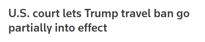 【美法院裁定特朗普旅行禁令部分生效 】周一,美国加利福尼亚州上诉法院裁定特朗普颁布的最新版本旅行禁令部分生效,允许美国政府禁止来自六个主要穆斯林国家,且与美国直接关联的该国公民进入美国。直接关系包括:家庭关系,以及与大学和移民安置机构等美国实体之间的“正式,书面”关系。