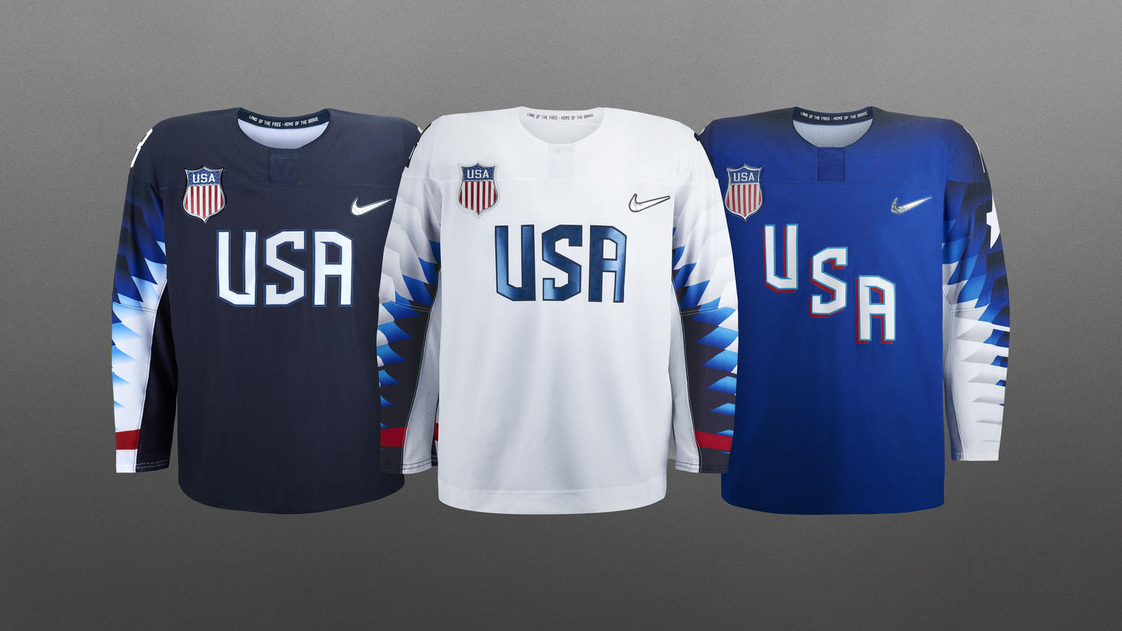 耐克为各国冰球队设计了战袍。美国队的战袍共有白、深蓝与浅蓝三种款式,袖子的设计则采用三角形堆砌而成,美国媒体评价称“这不是冰球服、而是足球服”。