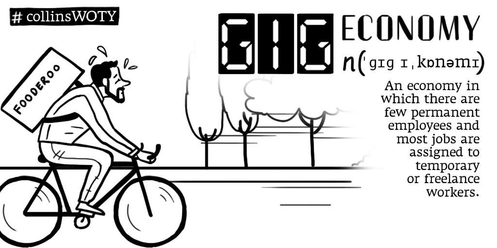 柯林斯的释义是:在这种经济模式下,(公司内)只有少数永久雇员,大部分工作由临时工或自由职业者承担。这里的gig原指艺人接到的临时表演工作,现在引申为个人或小团体接的“零活儿”,接活儿的人被称为gigger。