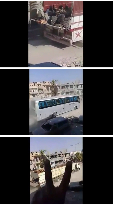 经过由美国主导的联军数月空袭后,曾经的旅游胜地拉卡城早已沦为废墟,亲美武装“叙利亚民主军”的人根本不见踪影。在城内等待上车的“旅客”,其实是大约250名ISIS士兵和3500名家属,以及成吨武器和弹药。在长达三天的旅程后,每名司机将获得数千美元作为酬劳,但他们必须对这单生意保持沉默。