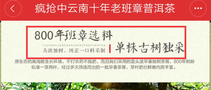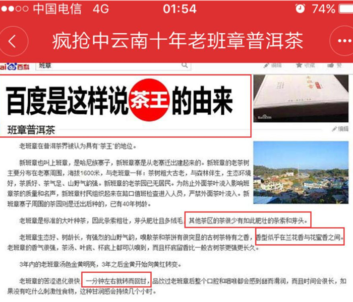 这里不考究截图中是不是百度说的,就其内容而言,用的抬头是“老班章普洱茶”,内容描述是接近普洱生茶的特性(还有很多专业错误),而店家卖的却是普洱熟茶,偷换概念这一招也是没谁了。