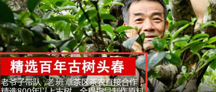 又一个典型的假茶劣质茶广告做法。图片是树丛中间露出一个老人家的头,文案配的是“老爷子带队”。这老爷子是谁、有什么资历我们统统不知道,那凭什么就能“全程指导制作原料”?这样做出来的茶你敢喝?反正编辑不敢。