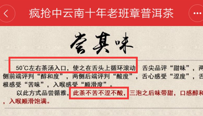 更有趣的是,下文竟然还会用“不苦不涩不酸”来形容一款所谓的“老班章”,如此叙述逻辑,你还真不能说他写错了,但这茶是有多糟糕需要用这样“朴实”的词语来形容其滋味?