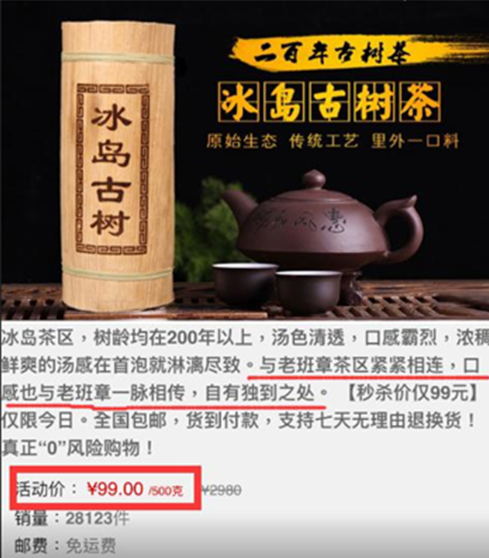 除了这假得不能恶劣的“老班章熟茶”,页面底部还有关联产品——99元的冰岛古树,真是“社会”。