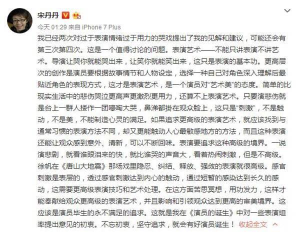 昨天,宋丹丹在微博上发布长文探讨“说哭就哭是基本功,表演要讲艺术”,相比其之前在节目中充当老好人、和稀泥引发网友的抵触,这或许可以看做她真正意义上第一次强烈发声表达自己的观点。