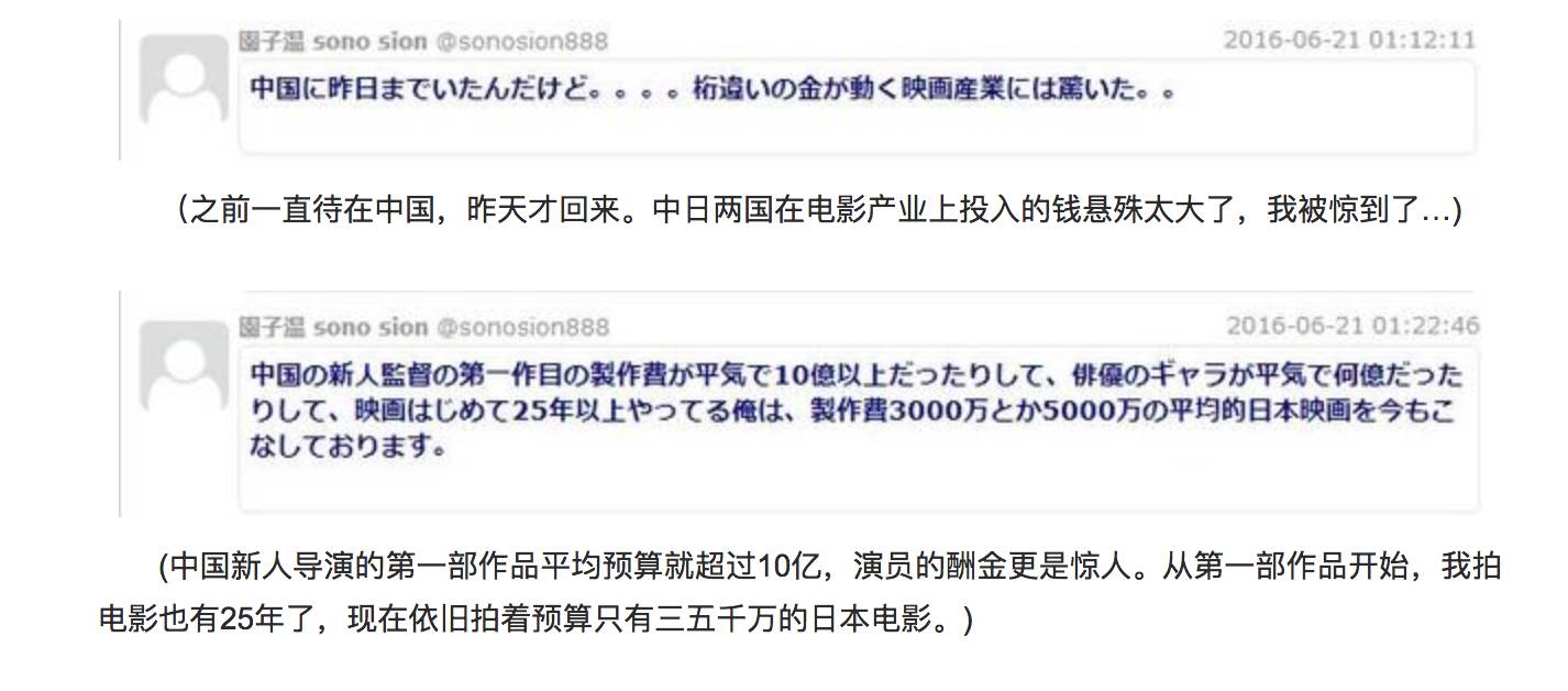 中日影视行业投资规模的巨大差异,也让日本同行眼红心热。导演园子温就在《妖猫传》投资规模新闻下连发9条评论: