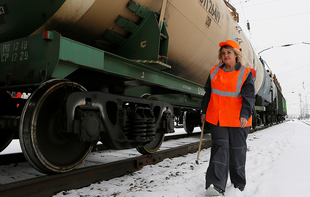 “甜甜圈小姐”Anastasia Pustovoitova是一位资深铁路安全巡视员,她正在叶尼塞河火车站检查一列火车。
