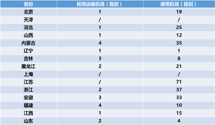 2017-2020年各省市A1、A2级通用机场和民用运输机场规划数量表