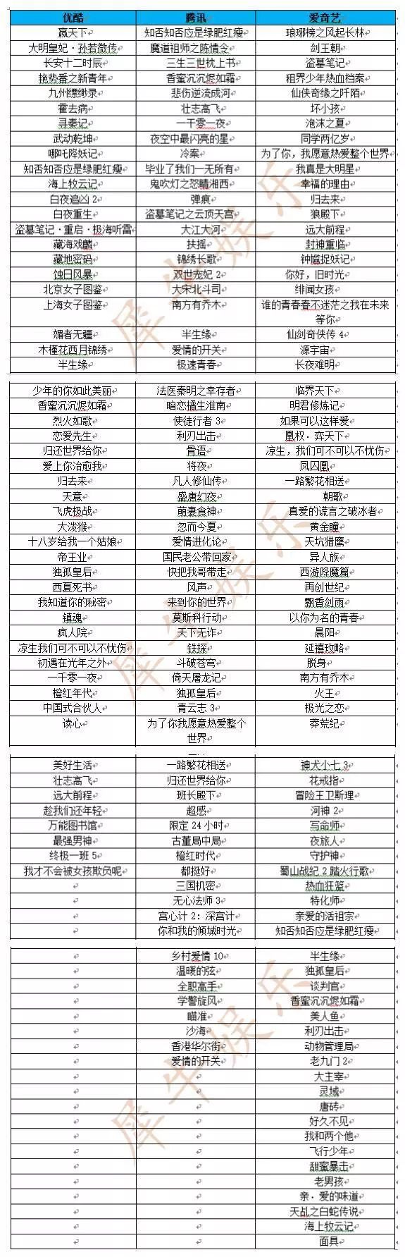 而腾讯、优酷、爱奇艺公布的剧集片单,分别为30部、58部、79部,一个比一个多。