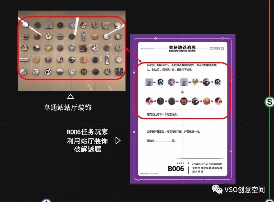 陈振:其实更多的是灵感和积累。因为我们一直也在设计真人密室和解谜游戏,所以对这块的积累很多,结合已有的内容进行设计其实是一种命题作文,思考的方向是如何创意地将信息呈现。比如这个是阜通站的装饰墙,它呈现的是内容,但不是“信息”,要把它加工成一个谜题,就需要赋予这个内容“信息”,比如特定的图案的连线,能成为数字。