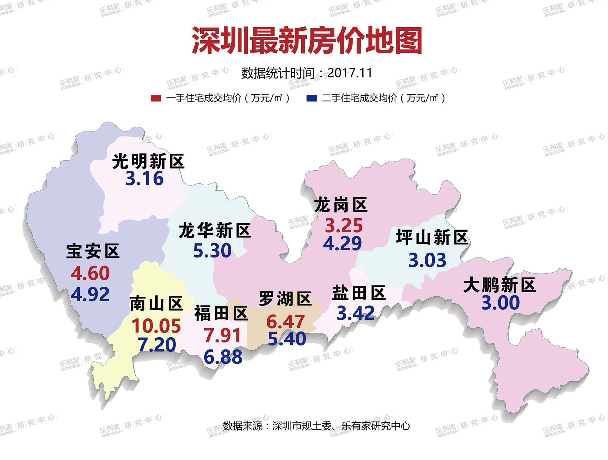 深圳一手住宅片区成交均价数据来源于深圳市规土委,因多个新区未分割出来单独计价,故缺少数据。二手住宅片区成交均价来源于深圳乐有家各门店成交信息及市场数据的收集整理。