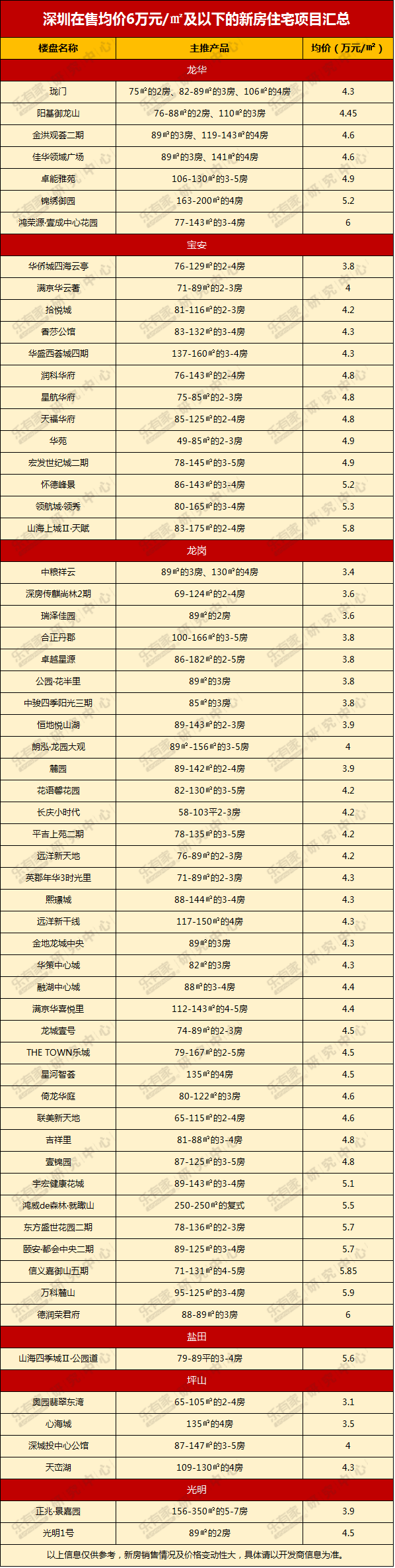目前,深圳在售一手住宅均价低于6万元/㎡的项目大多集中在龙岗与宝安,而这两个区域的二手房价格也是相对较低的,购房者可以多对比选择。