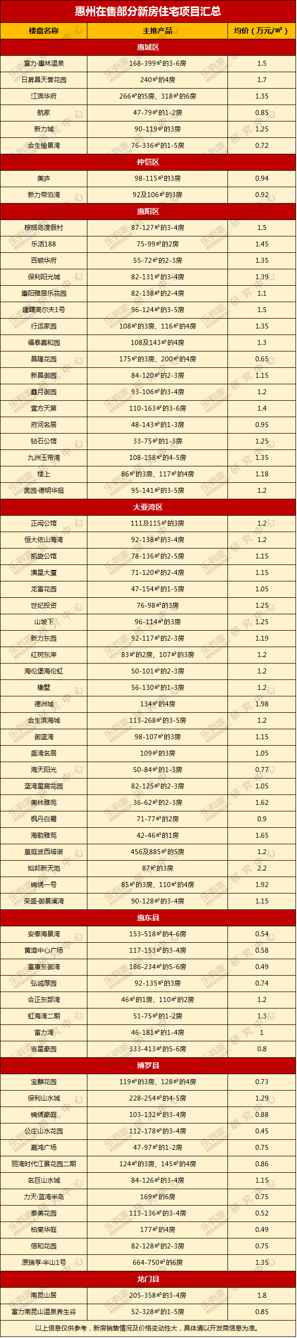 惠州新房供应较充足,二手房市场则相对较少人关注,而惠东及龙门的二手住宅市场成交情况几乎可以忽略。龙门县则由于一手住宅大多是别墅豪宅,故成交均价较高。