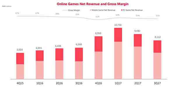 网易2017年第三季度在线游戏服务净收入为81.12亿元(12.19亿美元),同比增加23.5%。本季度,来自于手游的净收入占在线游戏服务净收入的68.3%,上一季度和去年同期该占比分别为72.4%和57.2%。