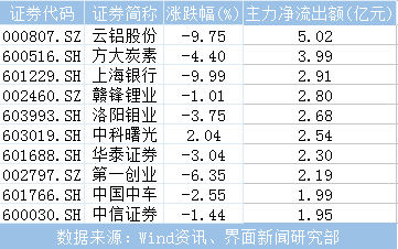 今日周期股大面积受挫,有色金属板块云铝股份(000807.SZ)、方大炭素(600516.SH)、赣锋锂业(002460.SZ)、洛阳钼业(603993.SH)分别遭遇主力净流出5.02亿元、3.99亿元、2.80亿元、2.68亿元。银行股、券商股亦成为主力资金重点出仓个股,上海银行(601229.SH)、华泰证券(601688.SH)、第一创业(002797.SZ)、中信证券(600030.SH)遭遇主力净流出额分别为2.91亿元、2.30亿元、2.19亿元、1.95亿元,上海银行更是上演“一字崩盘”。此外,中科曙光(603019.SH)、中国中车(601766.SH)已连续三日经历主力资金出逃,今日净流出额分别为2.54亿元、1.99亿元。