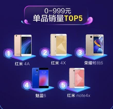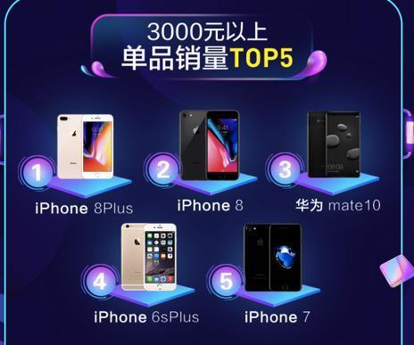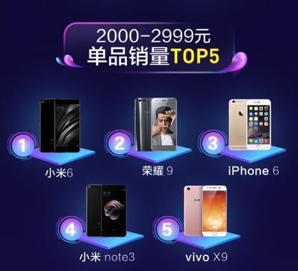 在京东那张海报上,苹果包揽了3000元以上、5000元以上、8000元以上销量Top5机型。当然,榜单中的华为也霸占了1000~2999元价位段的大部分位置。阿里天猫版本的海报则是小米占据了0~2999元价位段大部分位置。