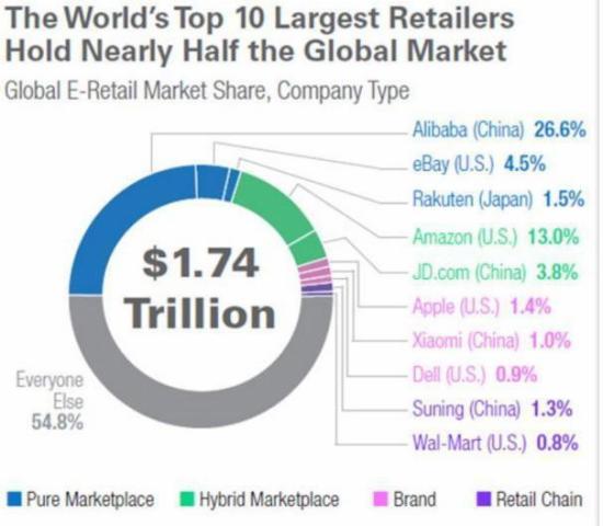 排名第一名到第七名的分别是:阿里巴巴占比26.6%、亚马逊占比13%、EBAY占比4.5%、京东占比3.8%、乐天占比1.5%、苹果占比1.4%、苏宁占比1.3%。