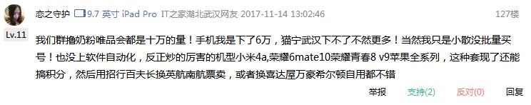 同时也有人在网上爆料,今年小米、华为荣耀都有刷单,红米4A、华为mate10都是刷单的重点机型。