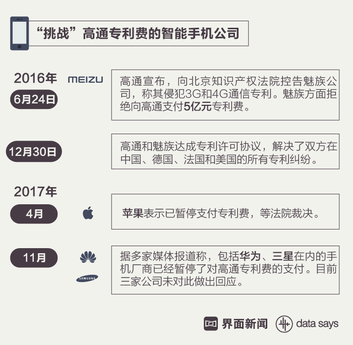 2017年11月中旬,据多家媒体报道称,包括华为、三星在内的手机厂商已经暂停对高通专利费的支付。虽然目前华为、三星以及高通方面都暂时未对此事进行回应,但高通已身陷暂停支付专利费危机。