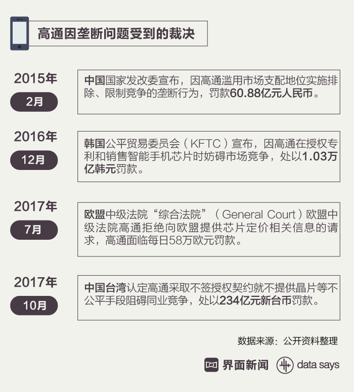 界面新闻记者此前曾报道,受到高通“专利反授权”的影响,拥有1247件专利的国内厂商几乎不能为此盈利。而据不完全统计,如果取消“高通税”,会让高通每年在中国市场的专利授权费用至少减少2至3亿美元。故在众多下游厂商们的呼吁下,中国国家发改委关注到了高通专利的问题并启动调查,现高通已因垄断问题受到四次裁决。