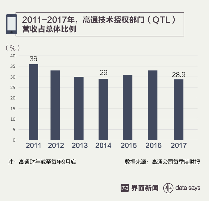 高通的主营业务分为高通CDMA技术(QCT)、技术授权(QTL)和战略举措(QSI)三大部分。技术授权部门主要负责对高通历年积累和收购的技术专利进行授权,常年占比高通总体营收的30%以上。