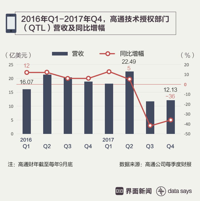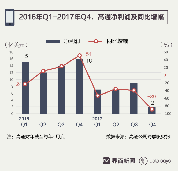 2017年11月2日,高通发布了2017年第四季财报,净利润为2亿美元,同比去年的16亿美元下滑89%;营收为59亿美元,同比去年的62亿美元下滑5%。高通对此解释称,主要原因是苹果及其供应商没有支付专利授权费。尤其从历史数据能看出,2017年第三、四财季的营收及净利润出现明显下滑。