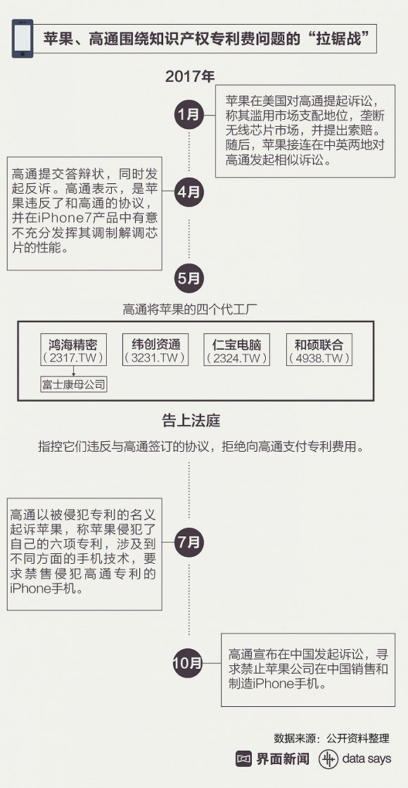 其中,苹果与高通的专利战最为引人注目。现高通已在中国起诉苹果,旨在禁止苹果在中国市场销售和制造iPhone。据苹果财报公布数据,2016年22.5%的营收来自大中华区市场,此事件的严重性不言而喻。