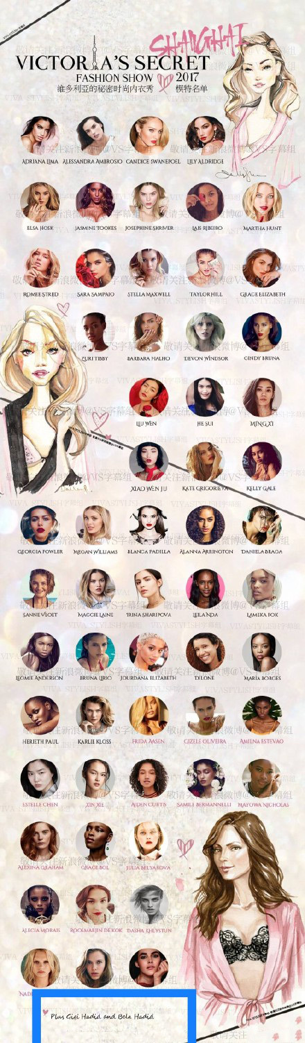 这次共有14位天使将出席大秀,目前61名模特确认上秀。而此前被抵制的“网红超模”Gigi和肯豆依然在名单之列!但是VS字幕组的抵抗也是很用心了哈哈哈哈哈哈,名单里没有她们的图片,把她们安排在了最后一行...