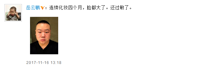 11月16日,岳云鹏在微博晒出自拍照并配文:“连续化妆四个月,脸都大了。还过敏了。 ”照片中,岳云鹏面容憔悴,脸颊上微微泛红疑似过敏。