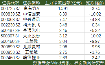 OLED巨头京东方A(000725.SZ)今日净流出额为14.91亿元,其股价亦下挫3.74%,收报6.18元/股。此外,中兴通讯(000063.SZ)、科大讯飞(002230.SZ)、亨通光电(600487.SH)亦被主力资金“抛弃”,分别净流出7.47亿元、3.48亿元、3.46亿元。国产芯片概念股遭遇大面积杀跌,士兰微(600460.SH)午后跳水跌停,净流出3.04亿元。此前强势的白酒板块出现回调,五粮液(000858.SZ)遭遇主力抛售,净流出2.75亿元。