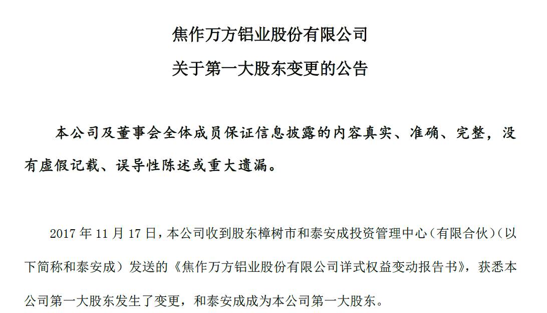 11月18日下午,焦作万方发布公告称,截至11月16日,和泰安成持有公司16.65%股份,为公司第一大股东,公司仍不存在控股股东和实控人。