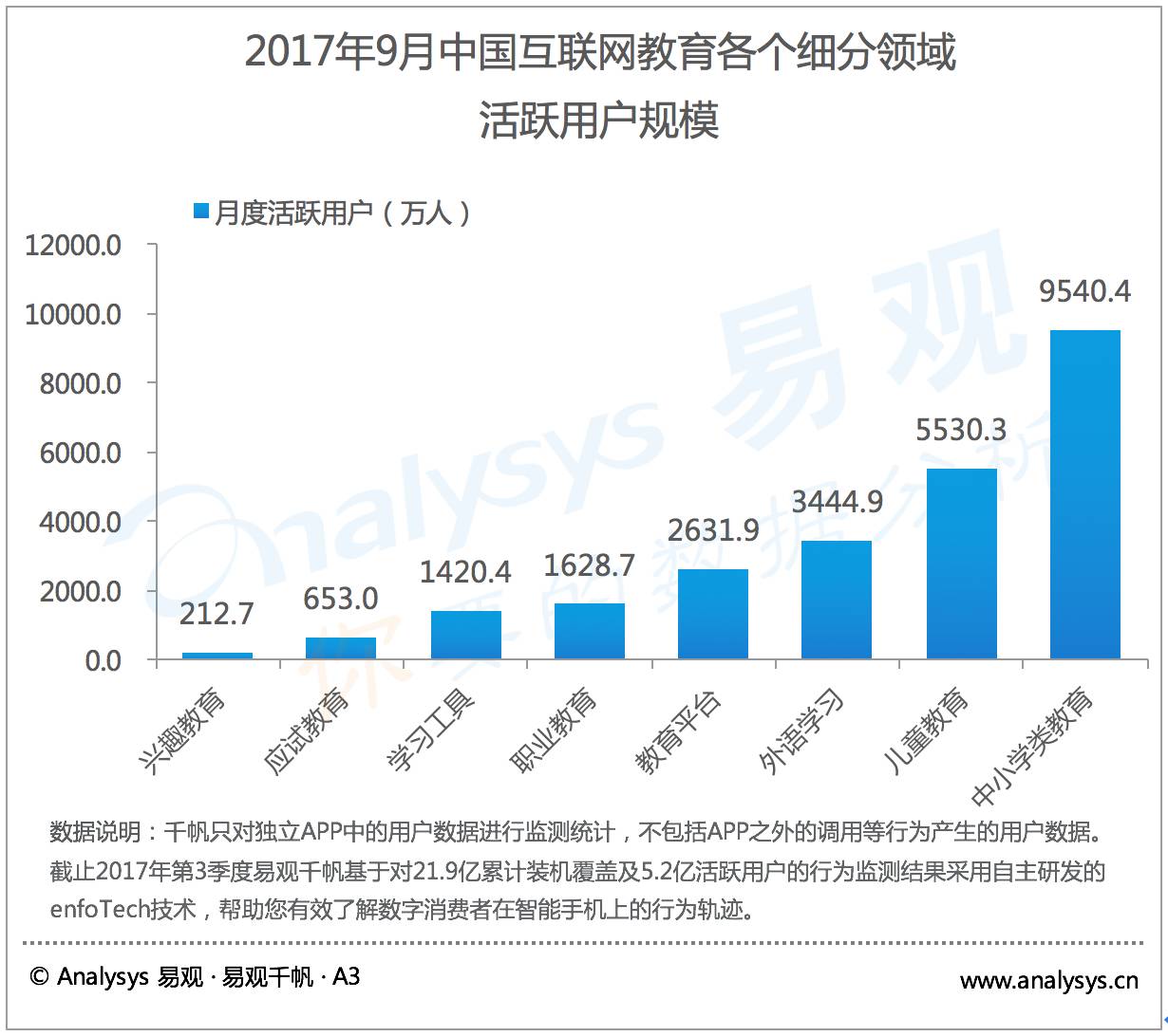 从本季度互联网教育用户角度来看,教育类App仍以儿童教育、中小学类教育两大二级领域为主,但整体表现有涨有跌。9月迎来开学,新学期的开始使得学生们纷纷回归校园,由于其刚需性,中小学类教育App受到广大学生用户们的青睐,使用频率明显增多,使得本月榜单中小学教育领域月活人数明显表现出普涨态势。与之相反的是,儿童教育领域整体来看,月活人数普遍表现出下滑趋势。根据Analysys易观千帆最新数据显示, 2017年9月中小学类教育领域整体月活用户达到9540.4万人,儿童教育领域整体月活用户达到5530.3万人。