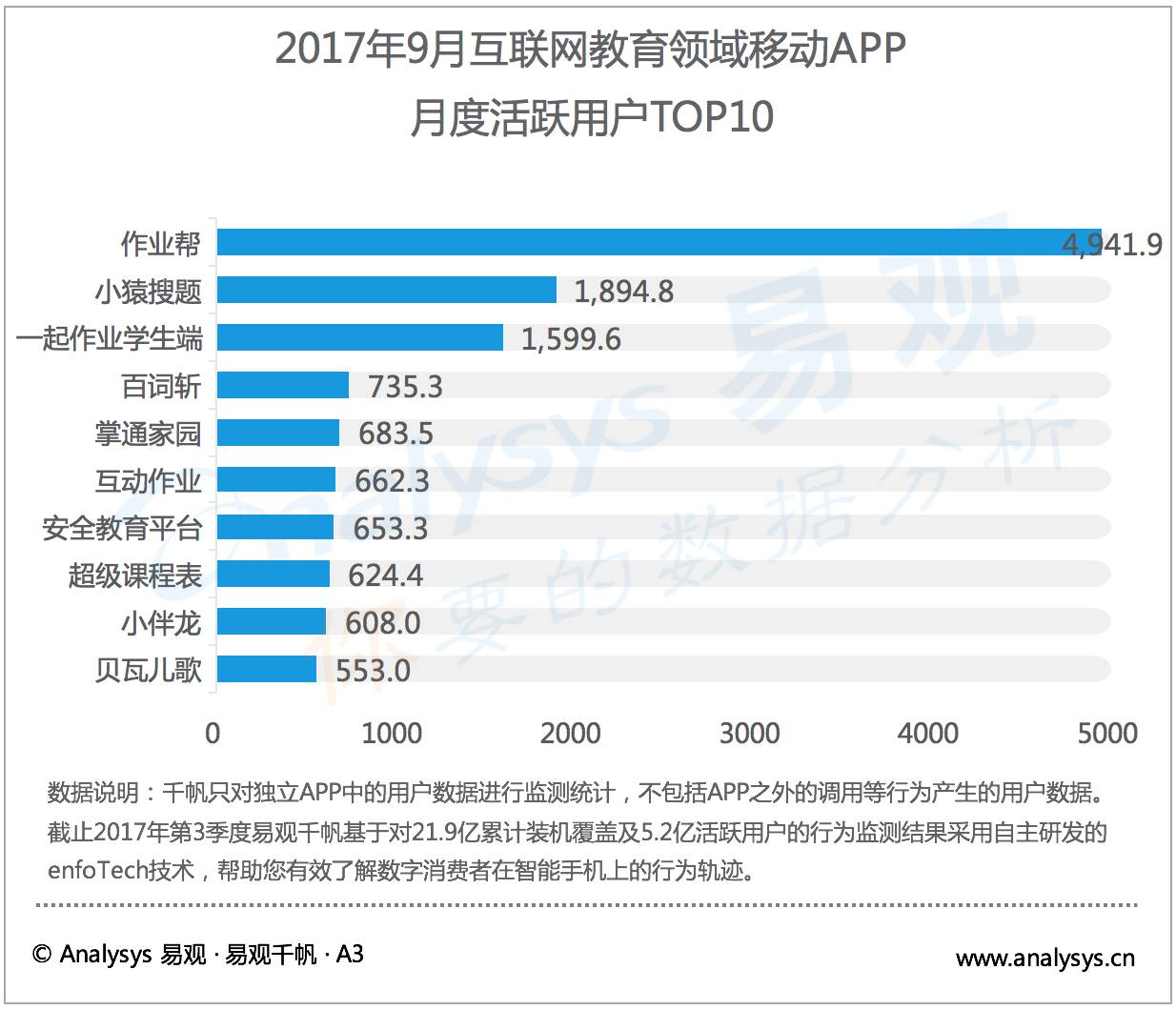 具体从2017年9月互联网教育领域移动App月度活跃用户TOP10来看,根据Analysys易观千帆数据显示,作业帮依然占据首位,9月月活用户达到4941.9万人,在暑假7、8月期间回落后重新上涨;小猿搜题以1894.8万人位居第二,一起作业学生端以1599.6位居第三。而这三个App都属于搜题类应用,看来新学期的开始,完成作业成为学生们每日必不可少的功课,搜题类应用使用场景明显增多,伴随着新学期,此类型App也迎来增长阶段。
