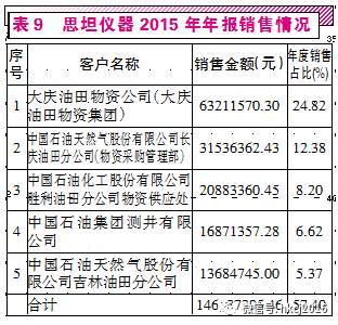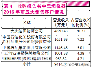 从细节来看,思坦仪器2015年的采购数据,根据海默科技发布的收购报告书披露,2015年第一大客户为“大庆油田物资公司”,涉及销售金额为6321.16万元(见表8),而思坦仪器2015年年报披露的针对该客户销售金额同样为6321.16万元(见表9),这意味着两版信息披露中至少针对油田类客户的销售收入核算范围和口径是一致。但是这也进一步凸显出前文所述的、2016年两版信息披露确认收入数据存在较大差异,是不符合正常逻辑的。