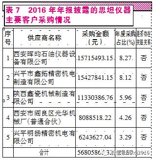 再来看一下2016年度的采购数据,同样也存在类似的问题。根据海默科技发布的收购报告书披露内容,思坦仪器2016年第一大供应商为“西安晖昀石油仪器设备有限公司”,涉及采购金额仅为1020.9万元(见表6),但是思坦仪器在2016年年报中则披露,2016年向该供应商采购了1571.55万元(见表7),两版信息披露相差高达500万元以上。与此同时,针对其他4家主要供应商也均存在金额不等的差异。
