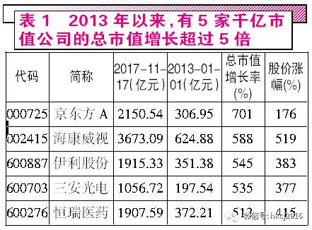 据Wind数据统计,在除去借壳上市的股票(例如顺丰控股、分众传媒)以及当年尚未挂牌上市的股票(例如美的集团、国泰君安)后,现有的68家千亿级别或以上的市值公司中,有41家在2013年时尚不足千亿市值。其中,有5家公司总市值增长了5倍以上,股价也随之飙升。(见表1)