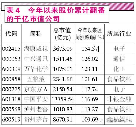 Wind数据显示,目前67家千亿市值的上市公司(华大基因为次新股,故被剔除在外)中,今年以来股价涨幅达到100%以上的有8家,涨幅在50%~100%的有18家,涨幅小于50%的有31家,而股价下跌的仅有10家。(见表4)