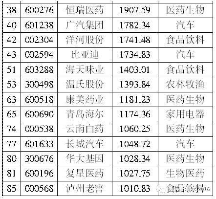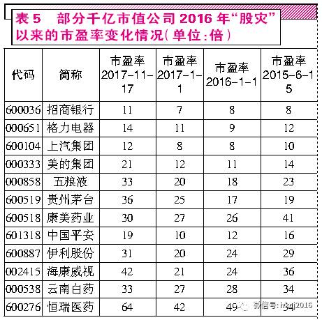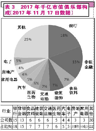 另外,在2013年时,28只千亿市值公司中金融股(银行+非银金融)有15家,权重占比为54%。但到2017年11月17日,金融股增加至28只,但权重占比却下降到33%,医药生物、家用电器等一批消费类白马龙头占据了市值排行榜前排。(见表2、表3)